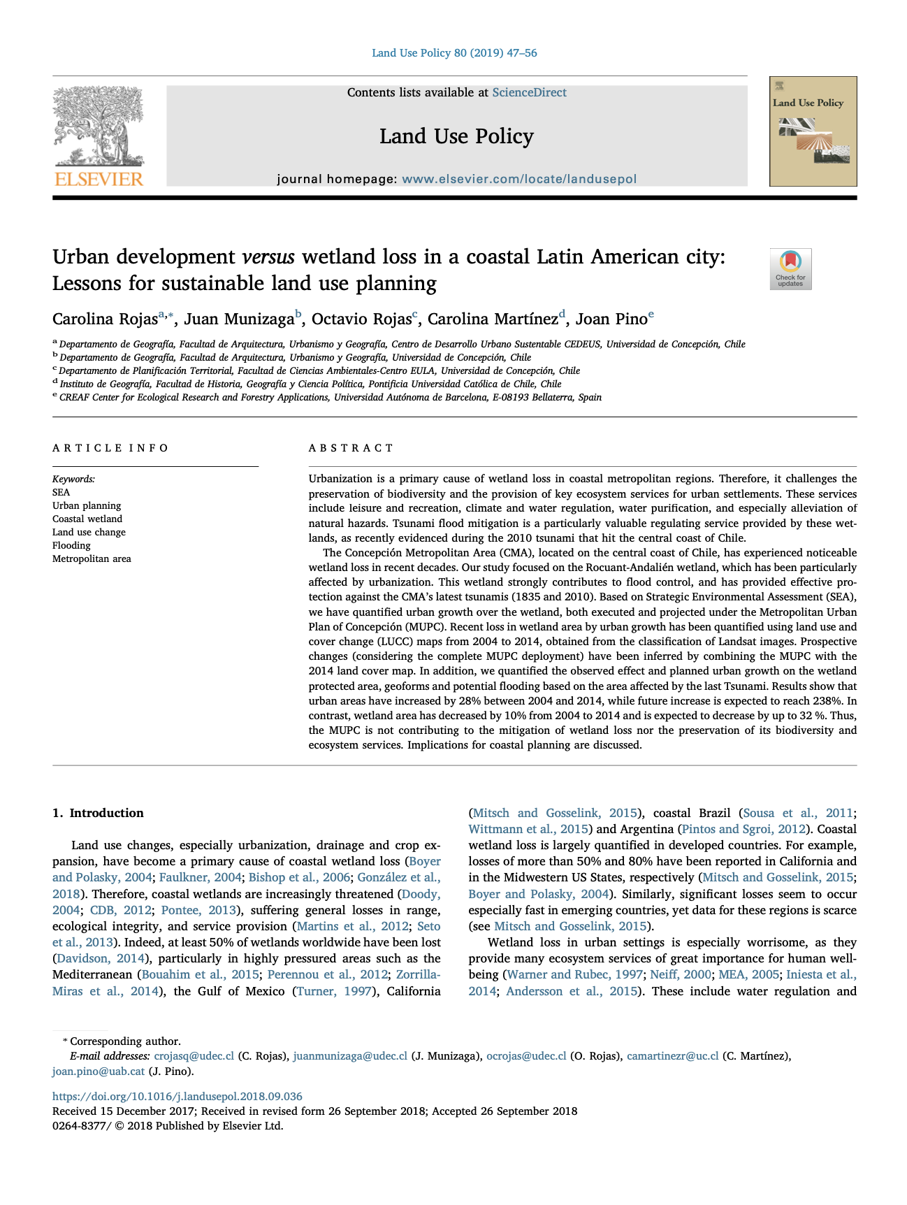 Se ha publicado recientemente el artículo de Rojas,C., Munizaga, J., Rojas, O., Martínez, C. & Pino, J. (2019). Urban development versus wetland loss in a coastal Latin American city: lessons for sustainable land use planning. Land Use Policy, 80, 47 – 56. El estudio aborda la problemática de urbanización del Humedal Rocuant-Andalién, el cuál mitigó la inundación del Tsunami de 2010. El artículo se encuentra disponible en el portada de la prestigiosa revista Land Use Policy.