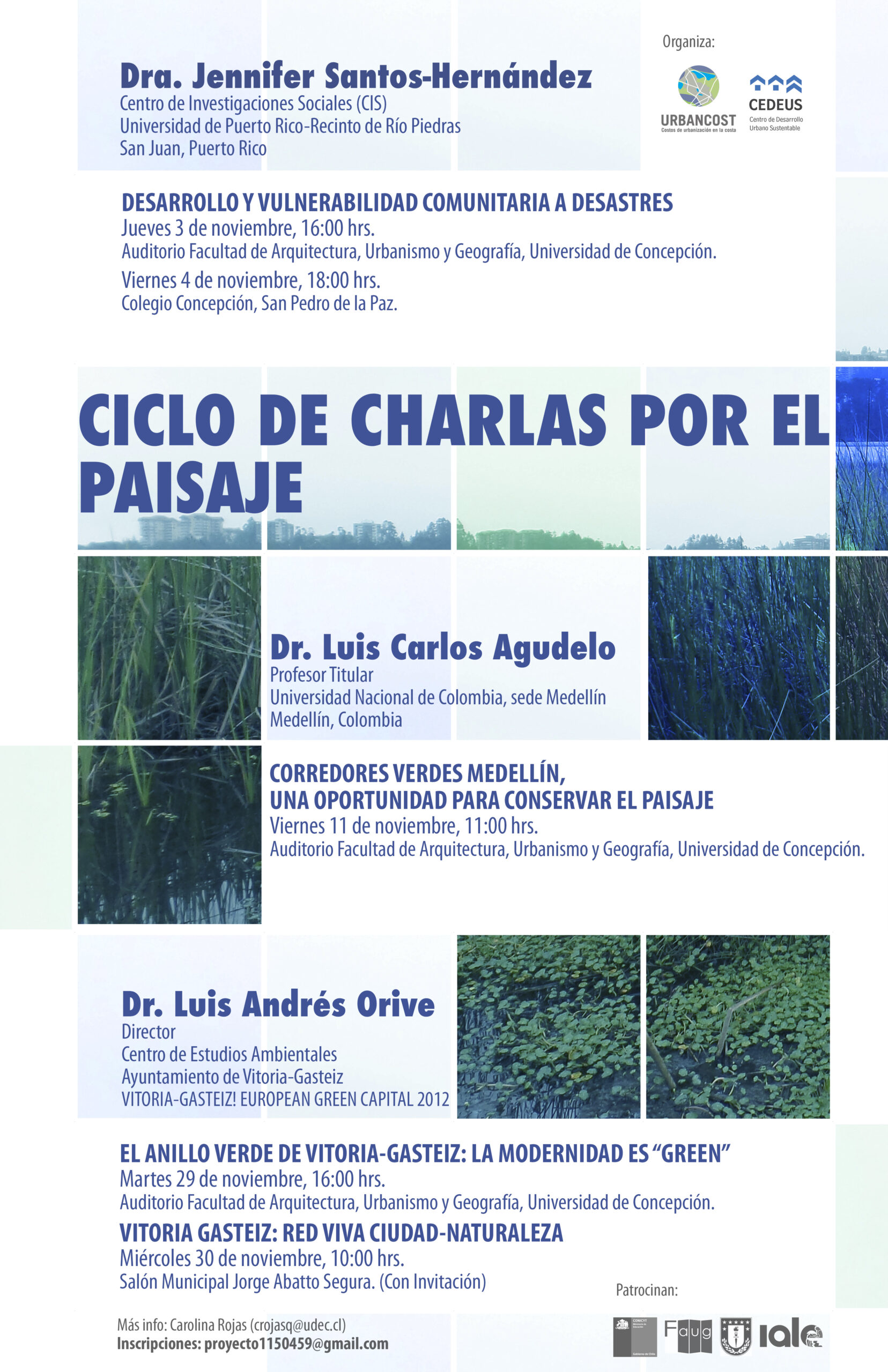 Estas charlas estarán a cargo de tres destacados investigadores internacionales: Dra. Jennifer Santos- Hernández del Centro de Estudios Sociales de la Universidad de Puerto Rico, Dr. Luis Carlos Agudelo de la Universidad Nacional de Colombia y Dr. Luis Andrés Orive, Director del Centro de Estudios Ambientales de Vitoria-Gasteiz.